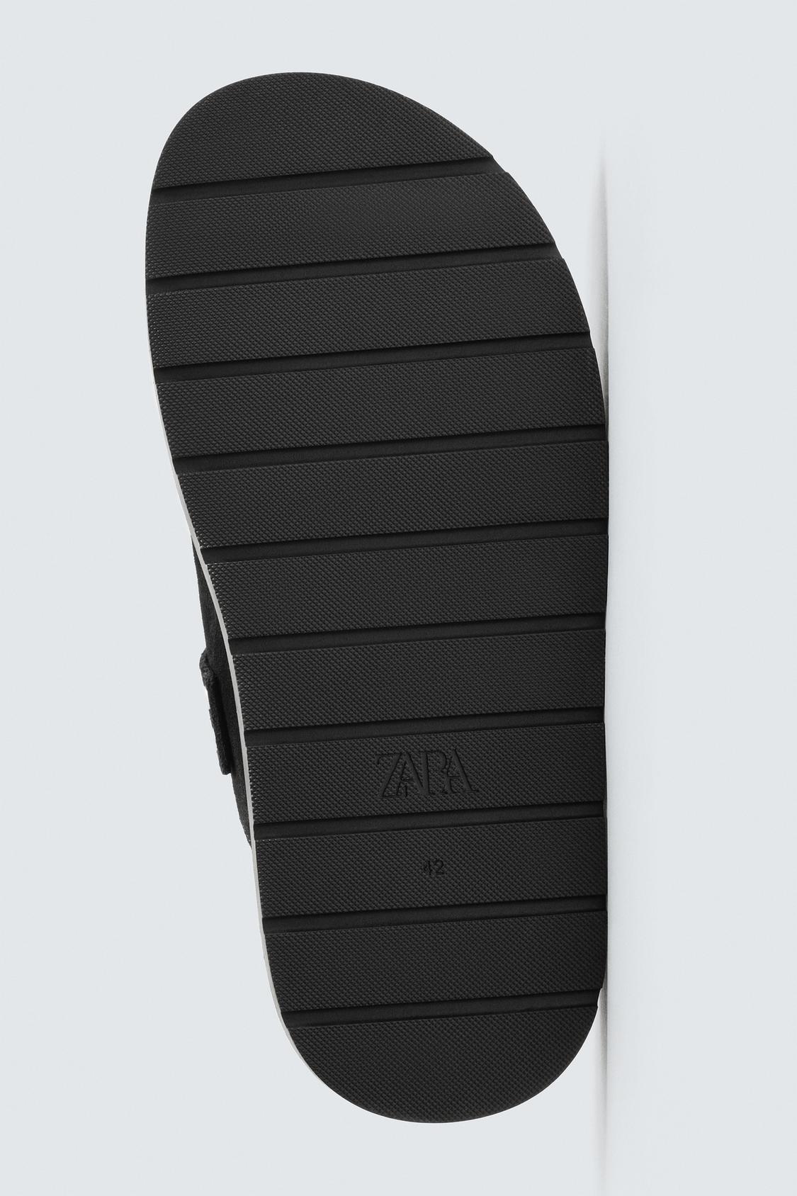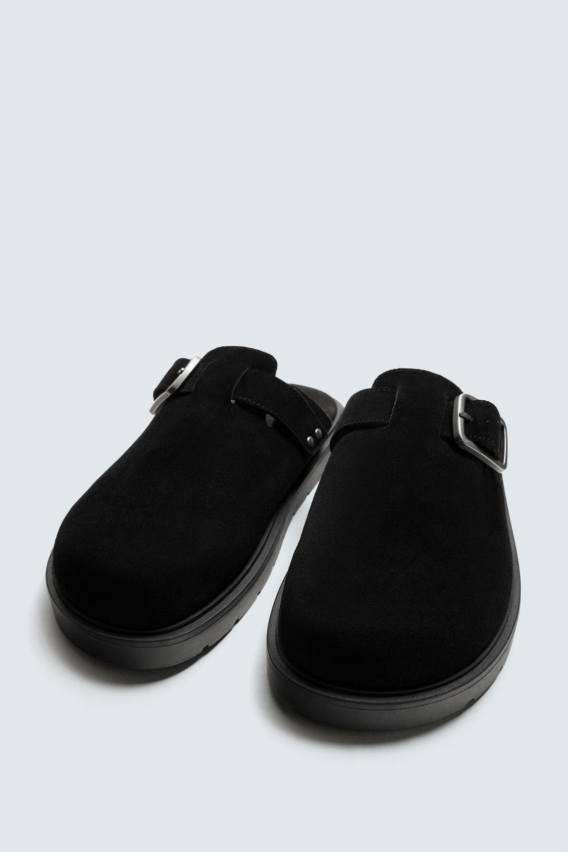 Zueco fabricado en piel con acabado serraje. Detalle de hebilla metálica en el empeine. Horma redonda. Suela con volumen en contraste de color.